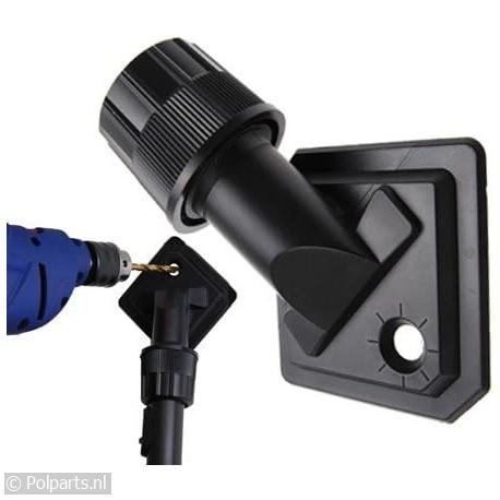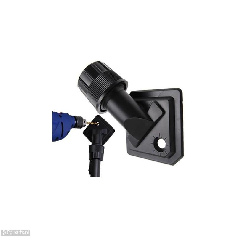 Borstel zit vast tegen de muur door de zuigkracht van de stofzuiger, hierdoor heb je beide handen vrij voor het boren.