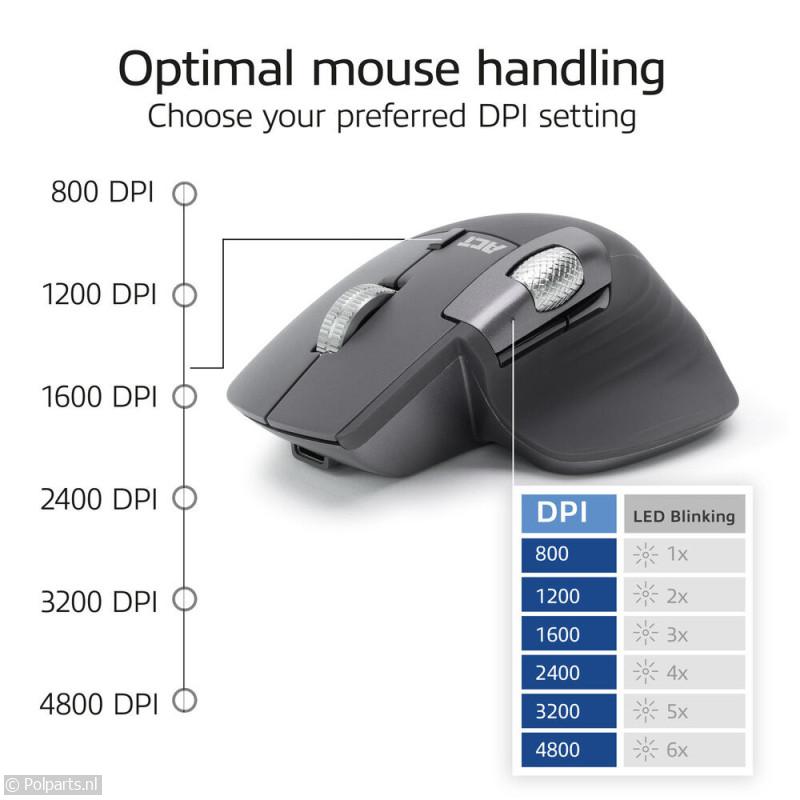 4800 DPI, USB-A ontvanger, 2x Bluetooth